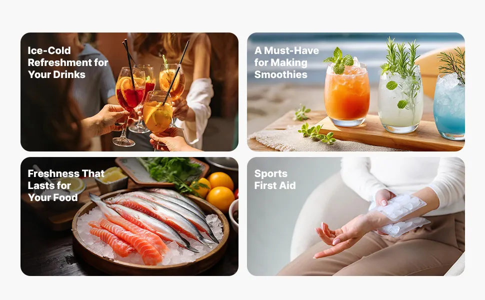 Przenośna kostkarka do lodu jest wszechstronna i służy do produkcji lodu do zimnych napojów, koktajli i konserwowania żywności. Można jej nawet używać do udzielania pierwszej pomocy w nagłych wypadkach.