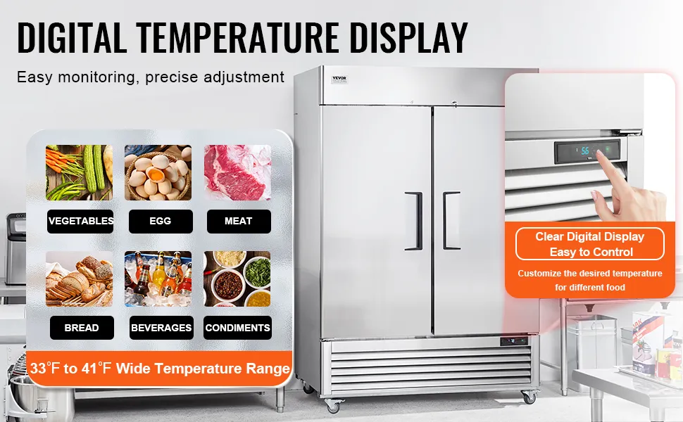 Zachowaj świeżość żywności na dłużej: komercyjna lodówka VEVOR o pojemności 1100 l (38,83 stóp sześciennych) łączy wydajne chłodzenie z cyfrowym wyświetlaczem temperatury, aby zachować świeżość składników i oszczędzać energię. Automatyczny system rozmrażania zapobiega gromadzeniu się szronu, zachowując smak i składniki odżywcze! Inteligentny wyświetlacz cyfrowy pozwala łatwo dostosować temperaturę do różnych potrzeb składników.