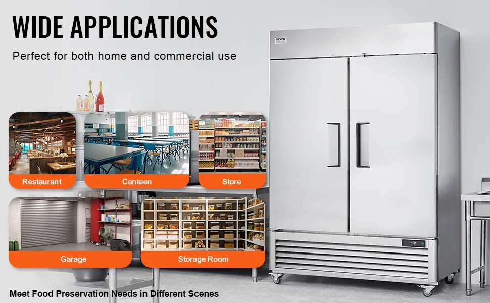 Wszechstronne zastosowania: Niezależnie od tego, czy pracujesz w kuchni restauracyjnej, sklepie detalicznym, czy kuchni domowej, nasza komercyjna lodówka ze stali nierdzewnej spełni Twoje potrzeby. Od restauracji i sklepów po garaże/magazyny – sprawdzi się w wielu sytuacjach i oferuje najlepsze rozwiązanie w zakresie przechowywania żywności.