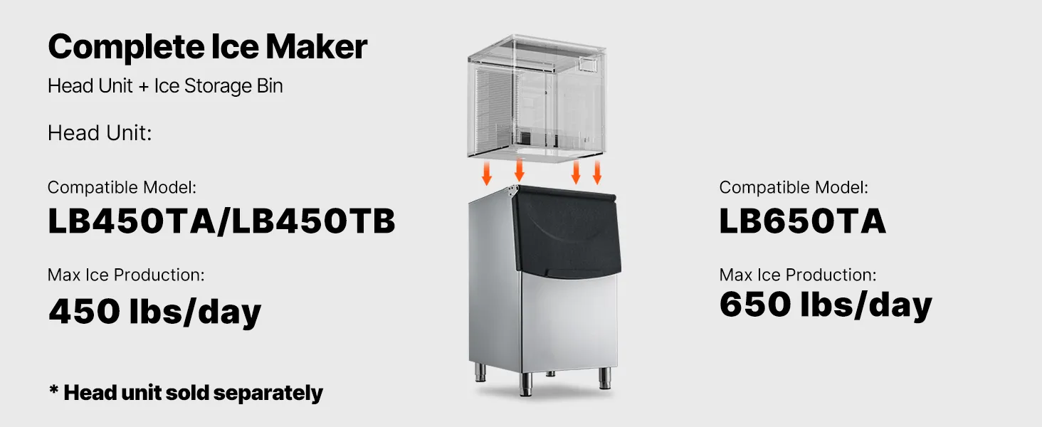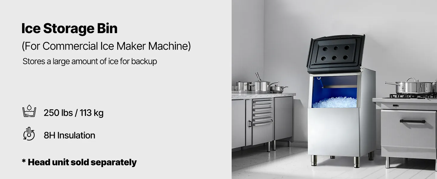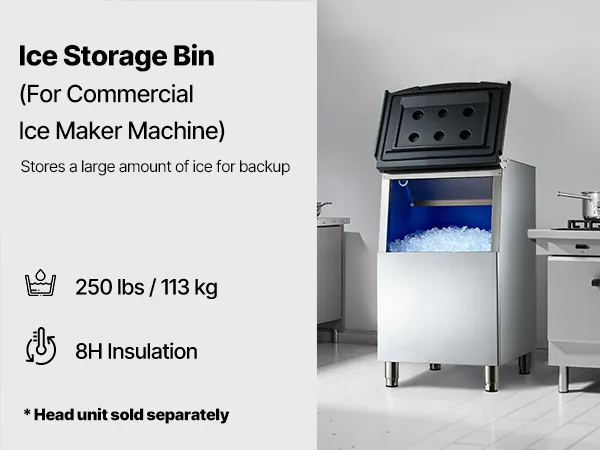 Duża pojemność magazynowania lodu: komercyjna kostkarka do lodu (pojemnik na lód) może przechowywać do 250 funtów (113 kg) lodu, zapewniając duży zapas lodu zaspokajający Twoje potrzeby.