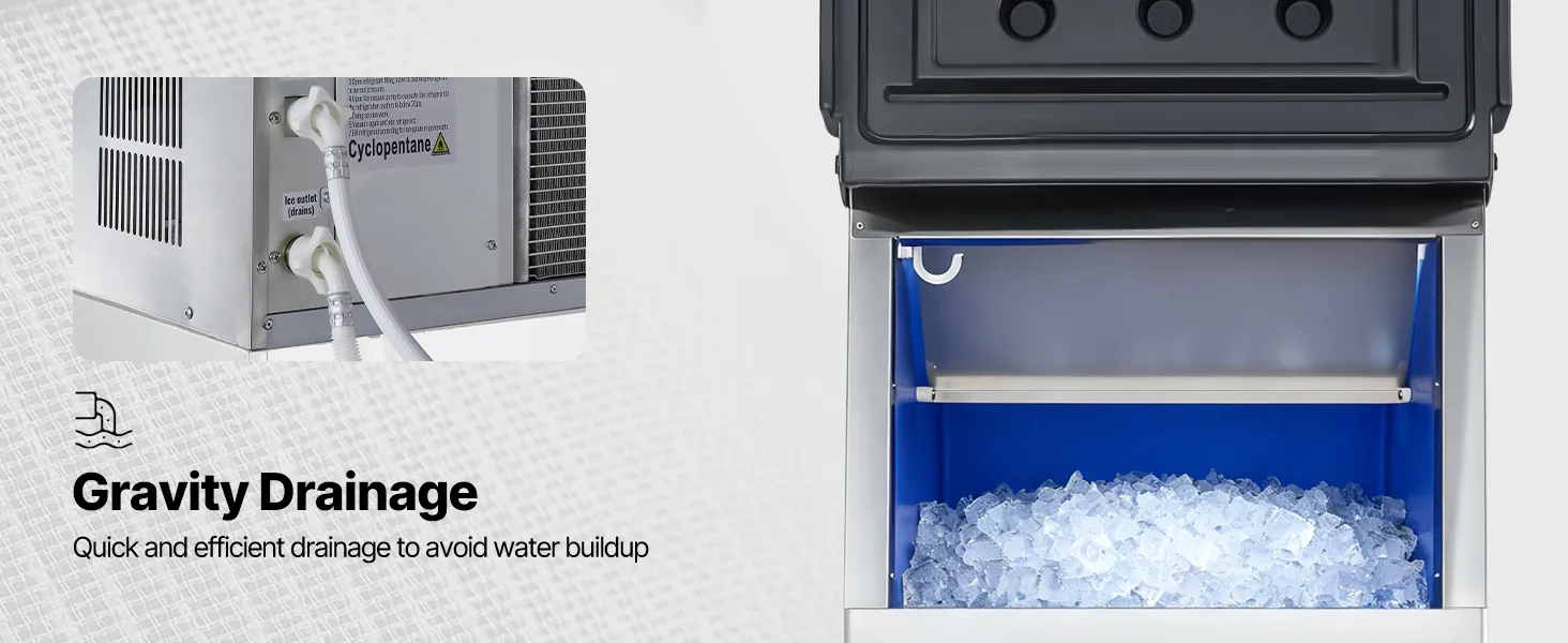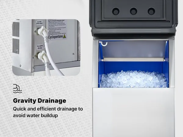 Odpływ grawitacyjny: Funkcja automatycznego odpływu zapobiega gromadzeniu się wody i zapewnia czyste i zdrowe środowisko do produkcji lodu.
