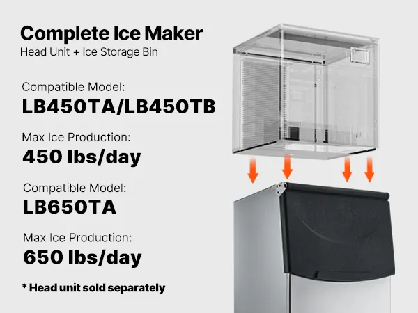 Jednostka główna i pojemnik na lód tworzą kompletną, komercyjną maszynę do lodów. Oferujemy konfigurację z pojemnikiem na lód o pojemności 113 kg, który jest dostępny osobno.