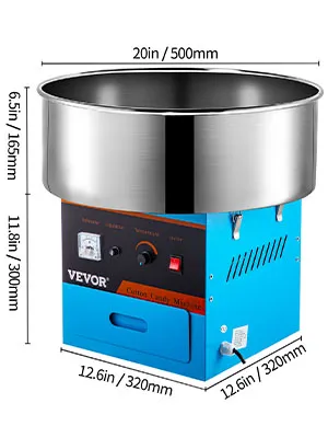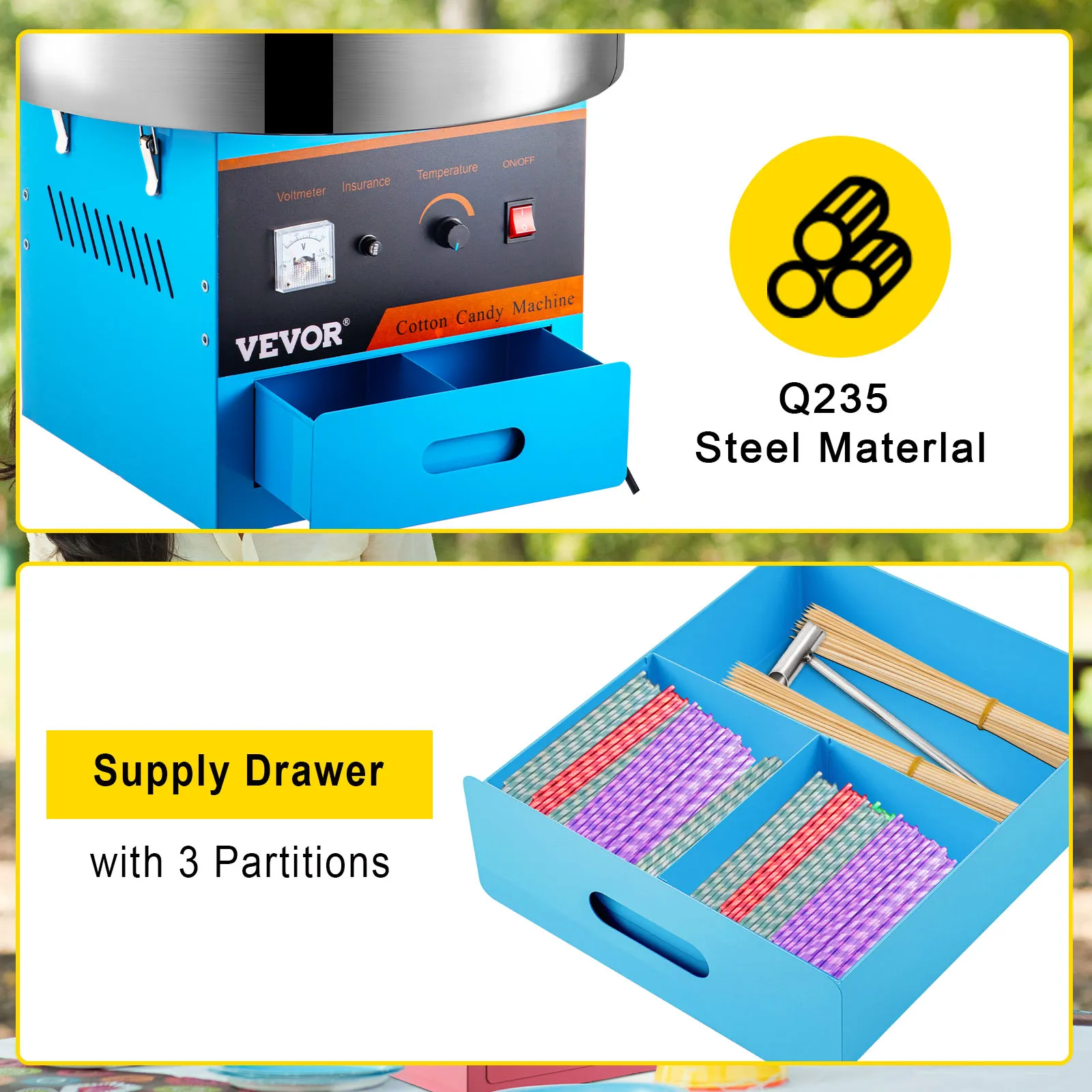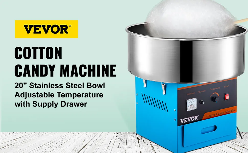 Przygotuj watę cukrową szybko i bez wysiłku dzięki naszej komercyjnej elektrycznej maszynie do waty cukrowej. Dzięki mocy 935W może pracować w sposób ciągły ze stałą szybkością produkcji 2 worków na minutę. W ciągu zaledwie kilku minut możesz przygotować pyszną watę cukrową na stoisko z jedzeniem, karnawał, festiwal lub imprezę. A atrakcyjny niebieski design sprawia, że Twoje stoisko będzie naprawdę przyciągać wzrok.