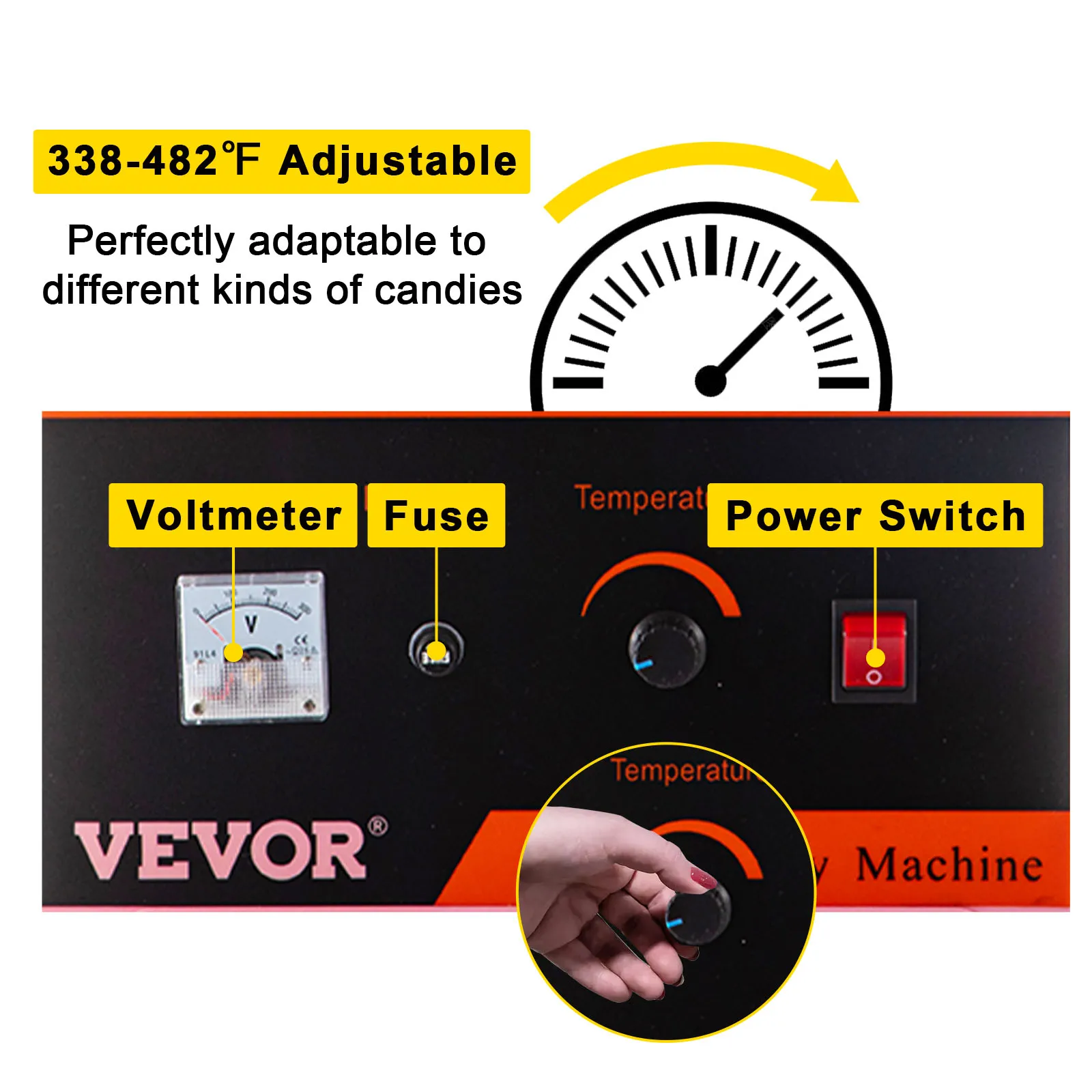 Panel sterowania posiada regulator temperatury, włącznik/wyłącznik, woltomierz i bezpiecznik, co czyni go dość łatwym w użyciu. Wystarczy go włączyć, ustawić temperaturę, poczekać, aż się rozgrzeje (5-6 minut), dodać cukier i zacznie robić watę cukrową.