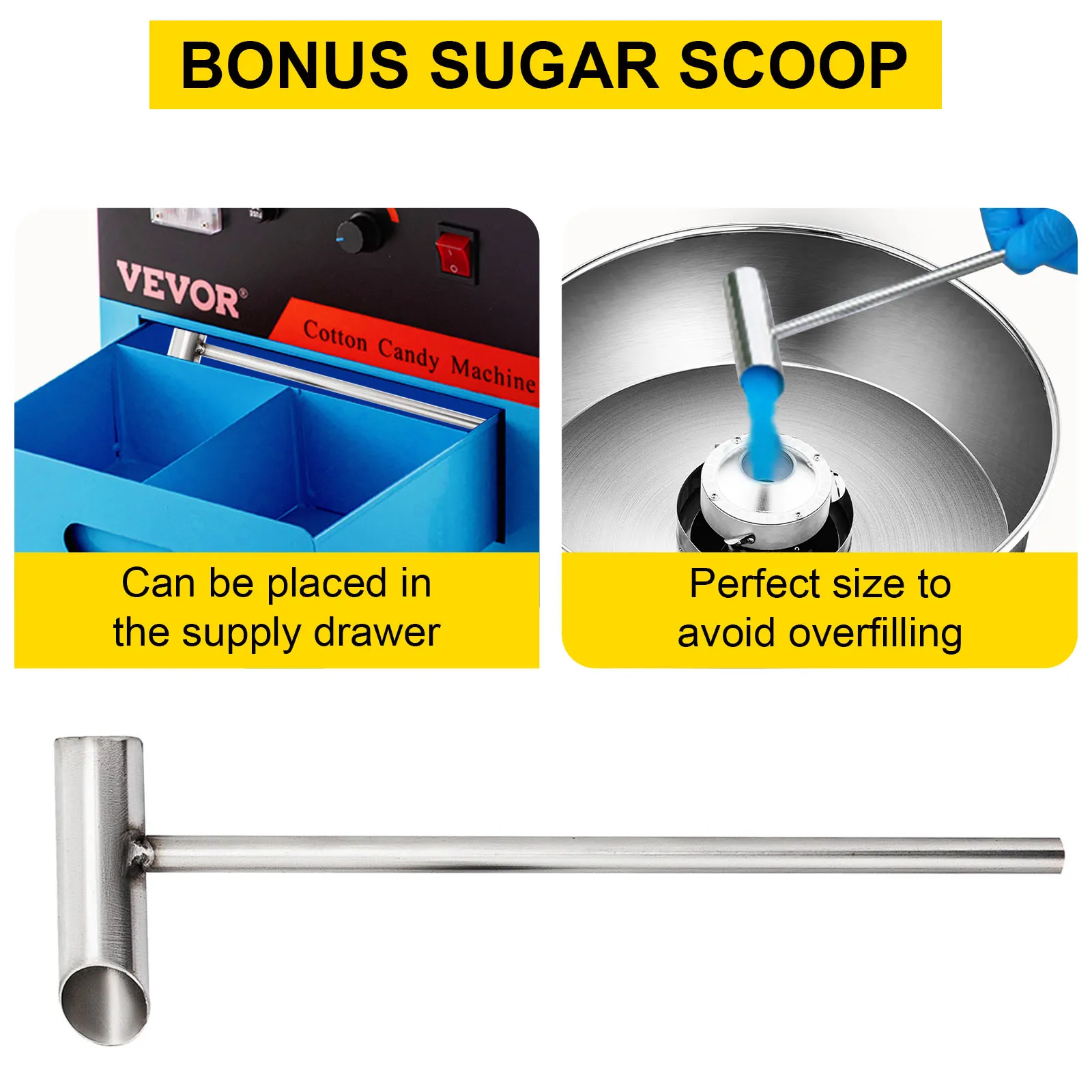 Do naszej komercyjnej maszyny do waty cukrowej dołączona jest łyżeczka do cukru jako dodatkowe akcesorium. Dzięki niemu wsypanie waty cukrowej do główki wirówki jest niezwykle łatwym zadaniem. Jest również średniej wielkości, aby uniknąć przepełnienia cukrem.