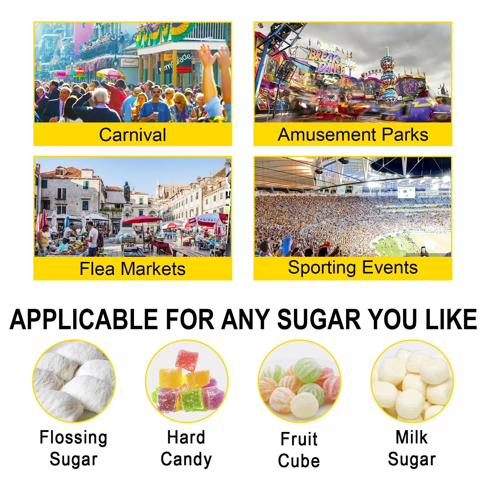 Wydajna głowica obrotowa może pomieścić do 4 uncji. (ok. 113 g) waty cukrowej, oszczędzając dodatkowy czas pracy. Poza tym moc grzewcza 900 W pozwala na szybkie nagrzanie komercyjnej maszyny do waty cukrowej w ciągu 5-6 minut, co pozwala na wyprodukowanie około 2 kawałków waty cukrowej w ciągu jednej minuty.