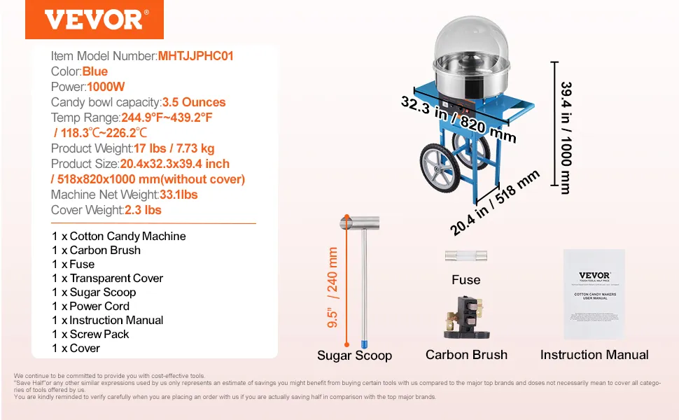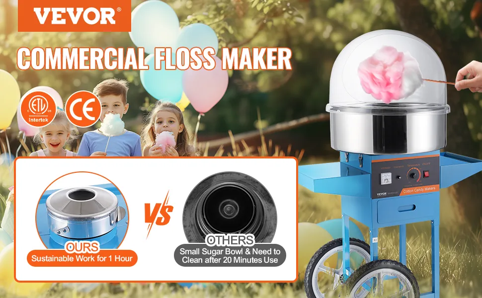 Elektryczna maszyna do waty cukrowej VEVOR z wózkiem, komercyjna maszyna do waty cukrowej o mocy 1000 W z pokrywą, misą ze stali nierdzewnej, łyżką do cukru i szufladką, na urodziny dzieci i przyjęcia rodzinne, kolor niebieski