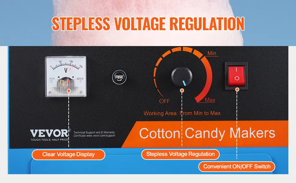 Kontrola temperatury: W przeciwieństwie do konwencjonalnych urządzeń, nasza elektryczna maszyna do waty cukrowej jest wyposażona w miernik napięcia i regulator temperatury. Zmieniając napięcie, można łatwo regulować temperaturę w zakresie od 118,3°C (244,9°F) do 226,2°C (439,2°F). To niezbędny element wyposażenia, jeśli chcesz spróbować różnych rodzajów cukru.