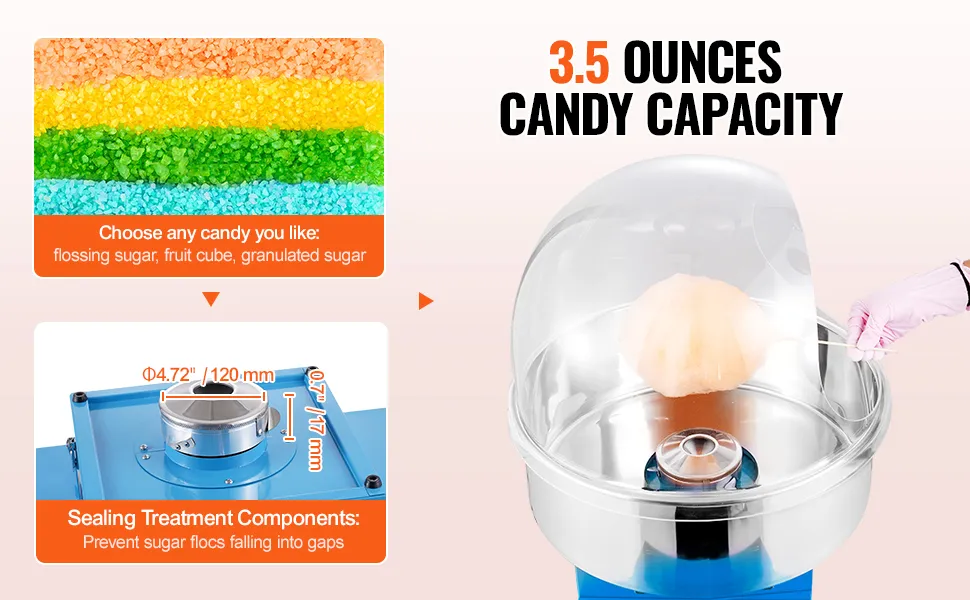 Przyjazna dla użytkownika konstrukcja: Ta maszyna do waty cukrowej jest wyposażona w pojemnik na cukierki, który zapewnia dodatkową przestrzeń do przechowywania rożków/pałeczek z watą cukrową lub opakowań z watą. Łyżeczka do cukru to wygodne akcesorium do nabierania i wysypywania cukru. Elementy uszczelniające zapobiegają wpadaniu płatków cukru do szczelin. Przezroczysta pokrywa zapobiega przedostawaniu się ciał obcych do waty cukrowej. Ponadto certyfikat ETL/CE gwarantuje większe bezpieczeństwo użytkowania.