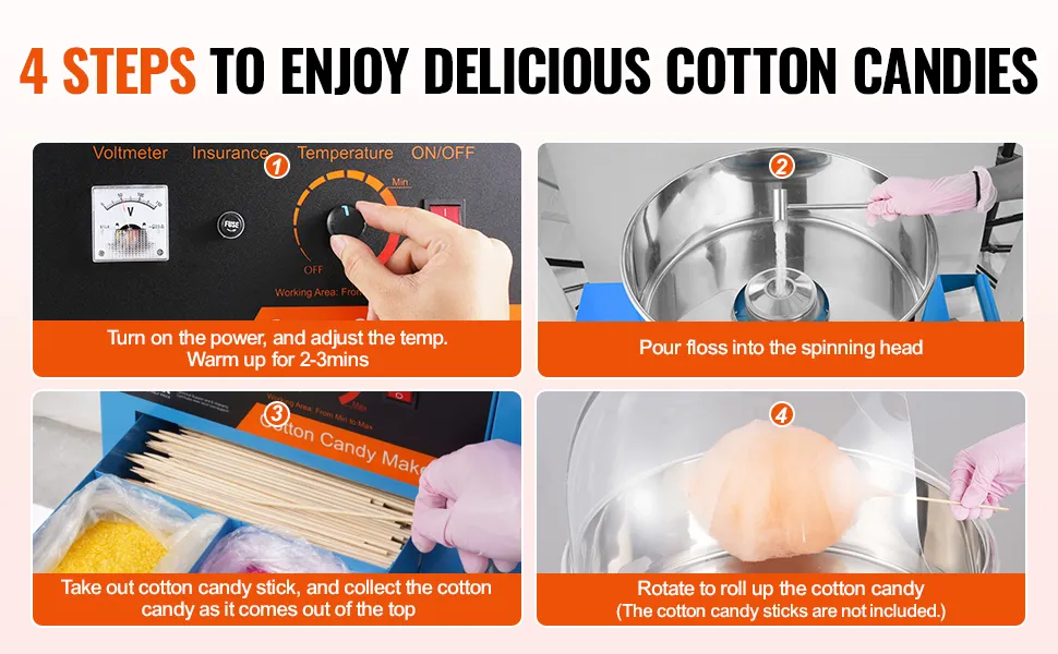 Łatwy w użyciu: Korzystanie z tego urządzenia jest dziecinnie proste. Włącz urządzenie, ustaw temperaturę, pozwól mu się nagrzać przez 2-3 minuty i wsyp cukier do wirującej głowicy. Następnie użyj patyczków, aby wyciągnąć watę cukrową z głowicy.