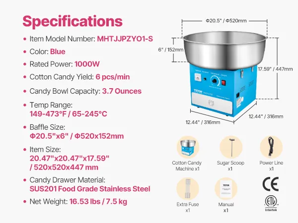 Ta maszyna do waty cukrowej jest wyposażona w silnik o mocy 1000 W i dużą misę do produkcji waty cukrowej, która produkuje maksymalnie 6 sztuk waty cukrowej na minutę. Dzięki tej maszynie produkcja waty cukrowej stanie się wydajniejsza i bezwysiłkowa.