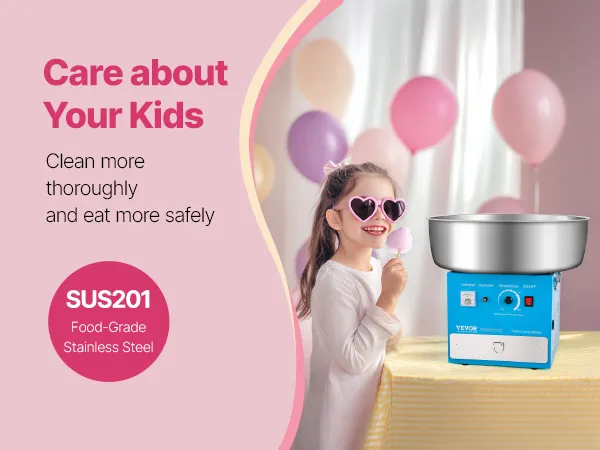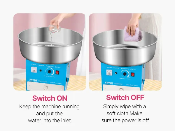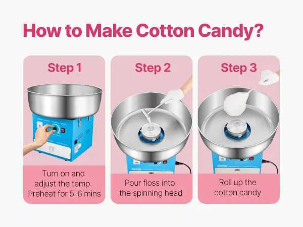 Łatwość użytkowania: Obsługa tego urządzenia jest dziecinnie prosta. Włącz zasilanie, wyreguluj napięcie, odczekaj 2–3 minuty, aż maszyna się nagrzeje, a następnie wsyp cukier do wirującej głowicy. Następnie wystarczy za pomocą patyczków do waty cukrowej usunąć watę z głowy. Nawet za pierwszym razem zrobienie idealnej waty cukrowej jest łatwe