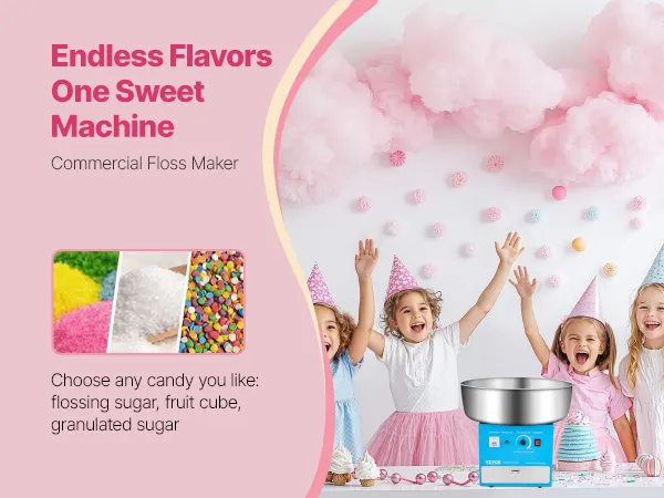 Pracuj z dowolnymi słodyczami: Dzięki tej maszynie do waty cukrowej możesz przygotować pyszną watę cukrową ze zwykłej waty cukrowej, cukru mlecznego, kostek owoców lub ulubionych słodyczy. Dzięki kompaktowym rozmiarom nadaje się do użytku na blacie kuchennym i doskonale sprawdza się na karnawałach, festiwalach, przyjęciach urodzinowych i wydarzeniach sportowych