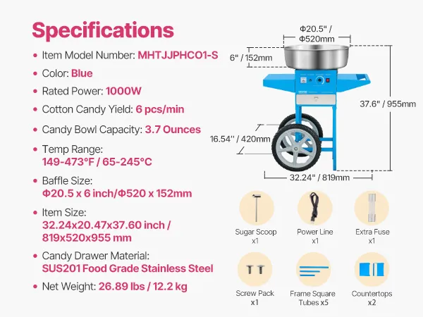 Elektryczna maszyna do waty cukrowej VEVOR, komercyjna maszyna do waty cukrowej z wózkiem (1000 W) z misą ze stali nierdzewnej o średnicy 52 cm, łyżką do cukru i szufladką, idealna na urodziny dzieci i przyjęcia rodzinne, niebieska