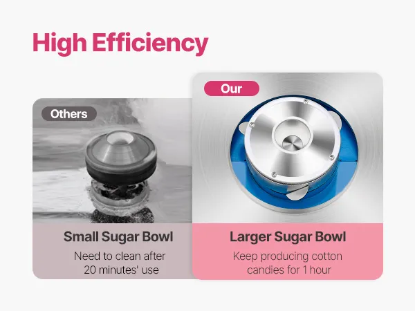 Ta maszyna do waty cukrowej jest wyposażona w silnik o mocy 1000 W i dużą misę do produkcji waty cukrowej, która produkuje maksymalnie 6 sztuk waty cukrowej na minutę. Dzięki tej maszynie produkcja waty cukrowej stanie się wydajniejsza i bezwysiłkowa.