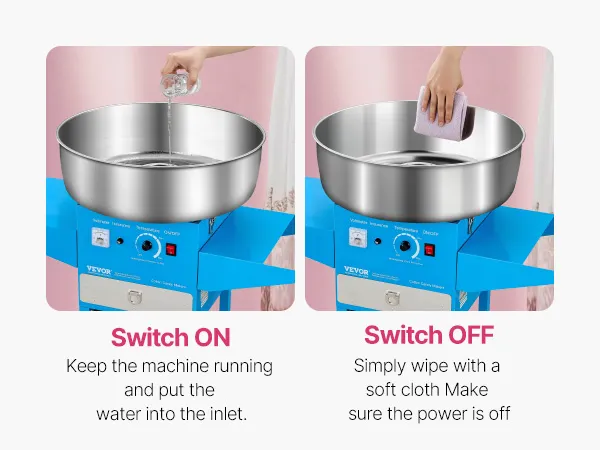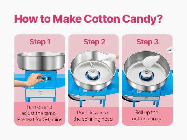 Łatwość użytkowania: Obsługa tego urządzenia jest dziecinnie prosta. Włącz zasilanie, wyreguluj napięcie, odczekaj 2–3 minuty, aż maszyna się nagrzeje, a następnie wsyp cukier do wirującej głowicy. Następnie wystarczy za pomocą patyczków do waty cukrowej usunąć watę z głowy. Nawet za pierwszym razem zrobienie idealnej waty cukrowej jest łatwe