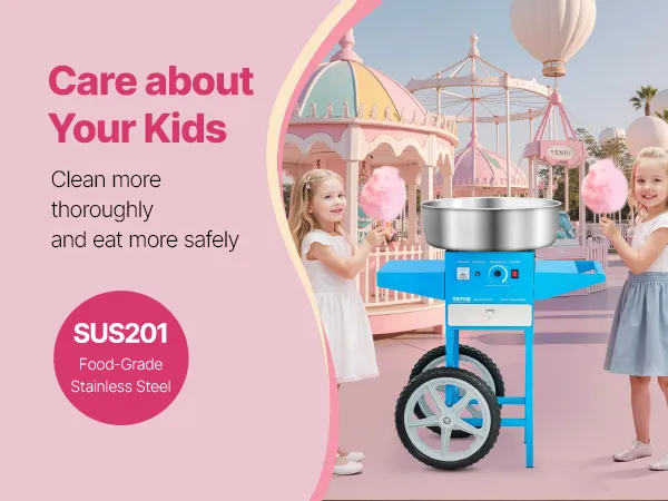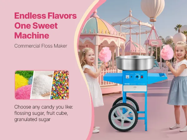 Pracuj z dowolnymi słodyczami: Ta maszyna do waty cukrowej z wózkiem pozwoli Ci przygotować pyszną watę cukrową przy użyciu zwykłej waty cukrowej, laktozy, kostek owoców lub ulubionych słodyczy. Duże koła i solidny uchwyt ułatwiają przemieszczanie i doskonale sprawdzają się na karnawałach, festiwalach, przyjęciach urodzinowych i wydarzeniach sportowych