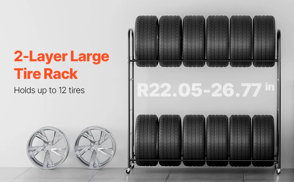 Zmaksymalizuj swoją przestrzeń: Dzięki dwupoziomowej konstrukcji, ten regulowany stojak na opony oferuje wystarczająco dużo miejsca do przechowywania nawet 12 standardowych opon. Utrzymuje opony w porządku, maksymalizuje przestrzeń do przechowywania i zapewnia porządek w garażu lub warsztacie.
