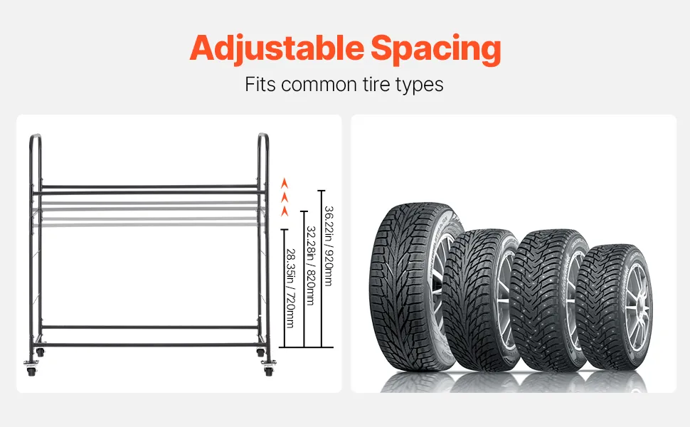 Ten stojak na opony ma regulowaną wysokość na trzech poziomach i nadaje się do przechowywania opon o różnych rozmiarach, od opon sezonowych po opony do kamperów, SUV-ów i ciężarówek.