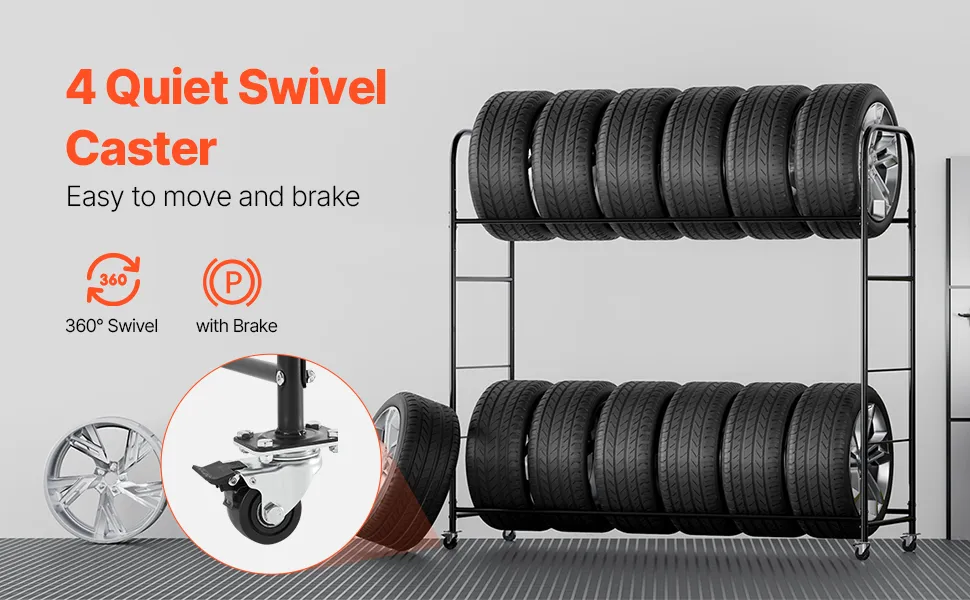 Wyposażony w cztery kółka obrotowe o 360°, ten stojak na opony jest łatwy w przemieszczaniu, nawet przy pełnym obciążeniu. Wbudowany hamulec utrzymuje stojak na opony bezpiecznie na miejscu, gdy nie jest używany, zapewniając stabilność i bezpieczeństwo.