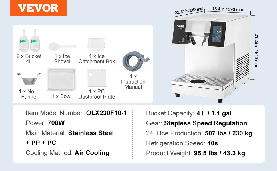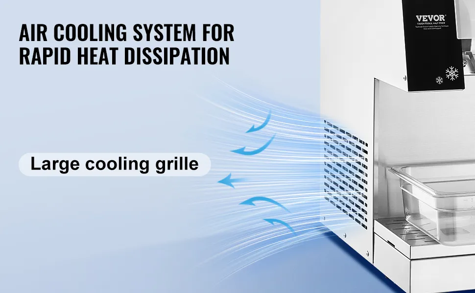 Ta chłodzona powietrzem kostkarka do lodu jest wyposażona w wydajny kompresor o mocy 700 W, który umożliwia szybkie schłodzenie w ciągu 40 sekund. Posiada dwa 4-litrowe kosze i może wyprodukować do 230 kg lodu dziennie.