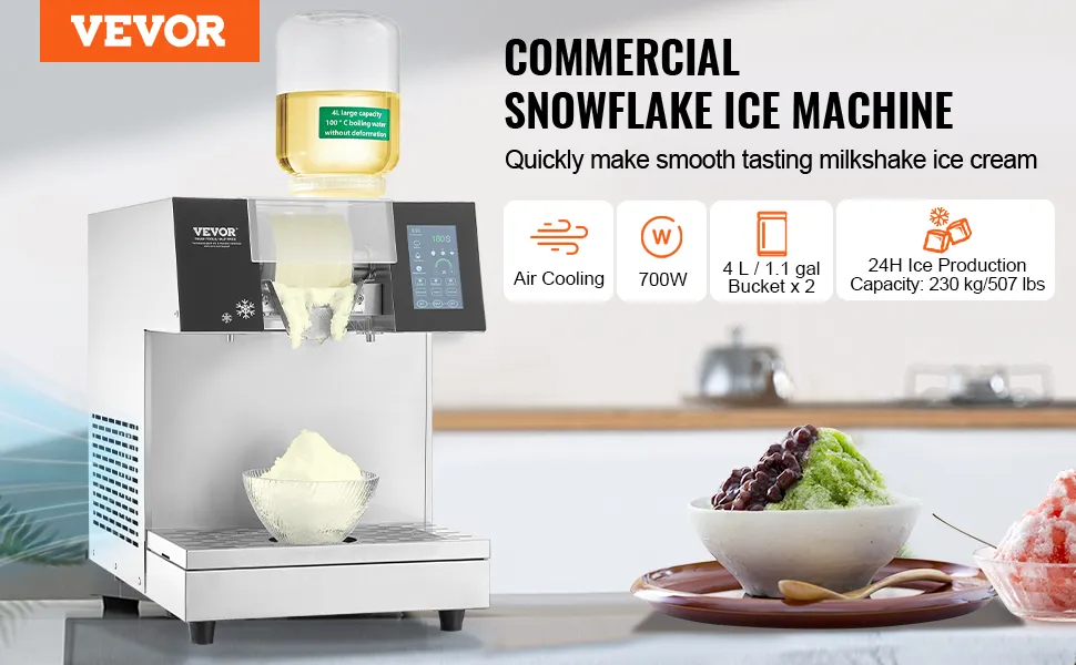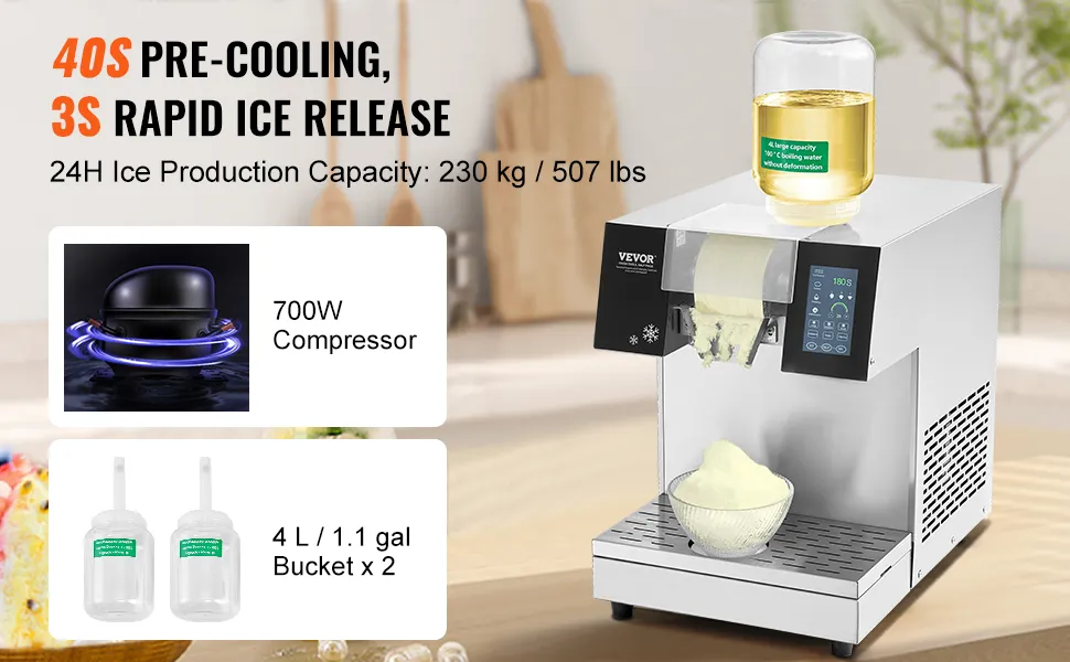VEVOR Komercyjna maszyna do lodu w płatkach śniegu, 230 kg/24 godz. Maszyna do lodu w płatkach śniegu, kruszarka do lodu ze stali nierdzewnej, elektryczna maszyna do lodu w rożkach z systemem chłodzenia powietrzem i dotykowym wyświetlaczem LCD