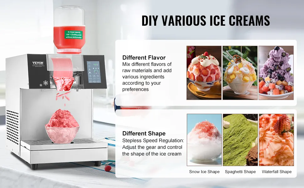 Różne kształty lodów: Dzięki regulacji prędkości wałków ta maszyna do robienia lodów w kształcie płatka śniegu produkuje lody o różnych fakturach, np. w kształcie śniegu, spaghetti i wodospadu. Każda z nich zapewnia aksamitnie gładką konsystencję.