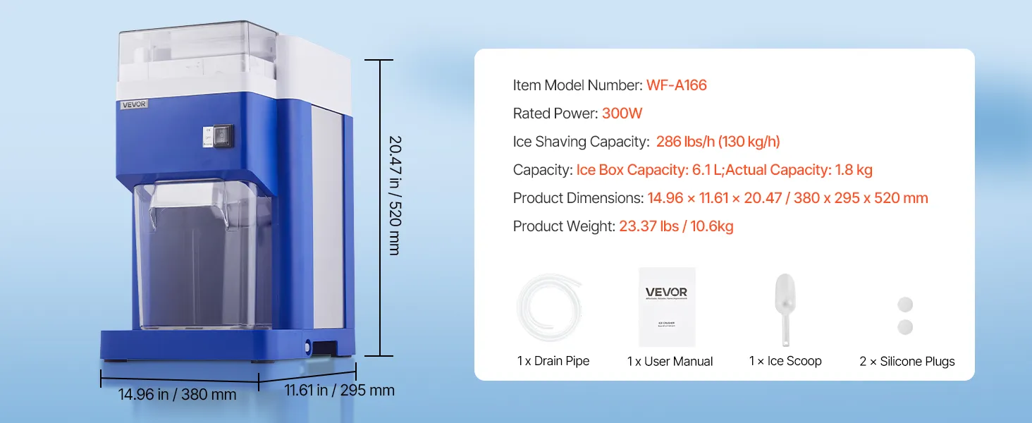 Wyposażona w mocny silnik i nowoczesne ostrza, ta kruszarka do lodu skutecznie kruszy lód na drobną, puszystą konsystencję. Jest łatwa w użyciu i idealnie nadaje się do cukierni, restauracji, na imprezy oraz do eksperymentowania z niekończącymi się lodowymi kreacjami.