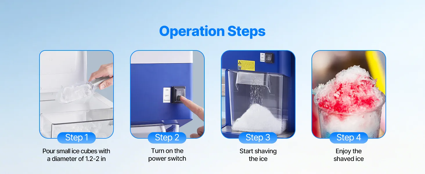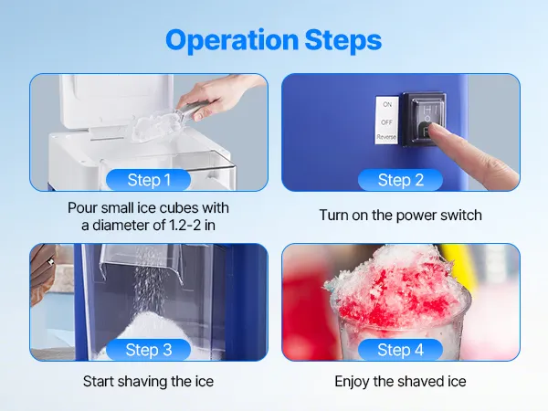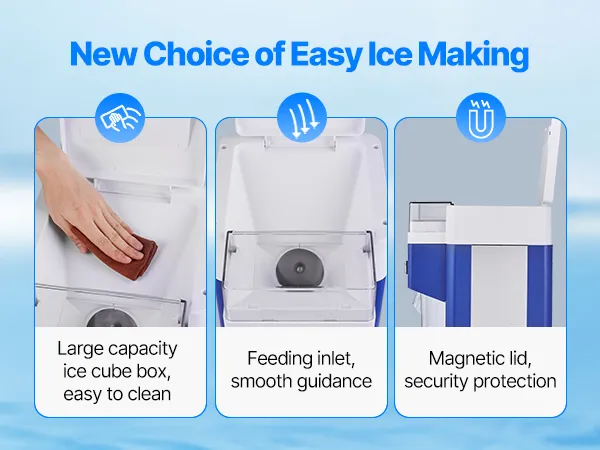 Bezpieczne i wygodne: Obsługa za pomocą przycisków dotykowych sprawia, że kostkarka do lodu jest łatwa w obsłudze. Funkcje bezpieczeństwa obejmują osłonę ochronną, zabezpieczenie przed przeciążeniem oraz przełącznik kierunku obrotów zapobiegający zacinaniu się, dzięki czemu możesz jej używać bez obaw.