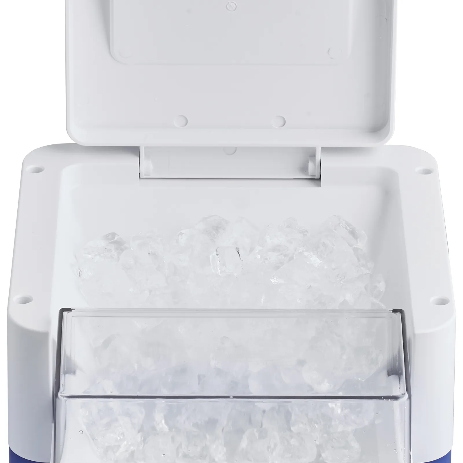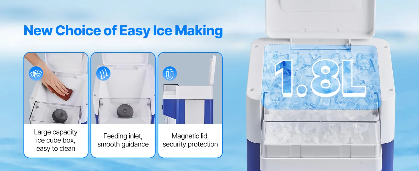 Pojemny pojemnik na lód: Pojemnik na lód o pojemności 1,8 l zmniejsza potrzebę częstego uzupełniania. Przezroczyste okienko pozwala na szybki podgląd poziomu lodu, zapewniając stały dopływ lodu, który zaspokoi wszystkie Twoje potrzeby.