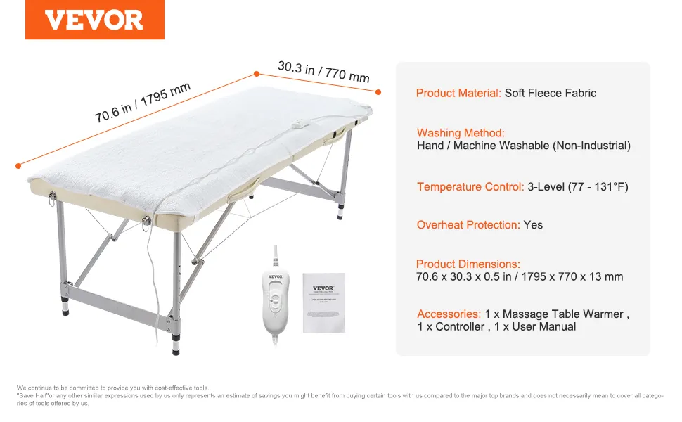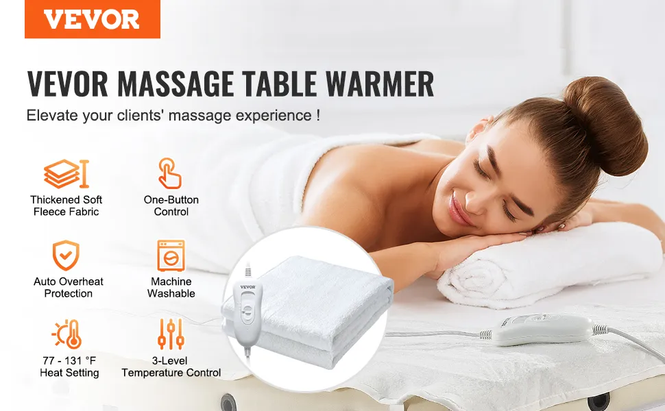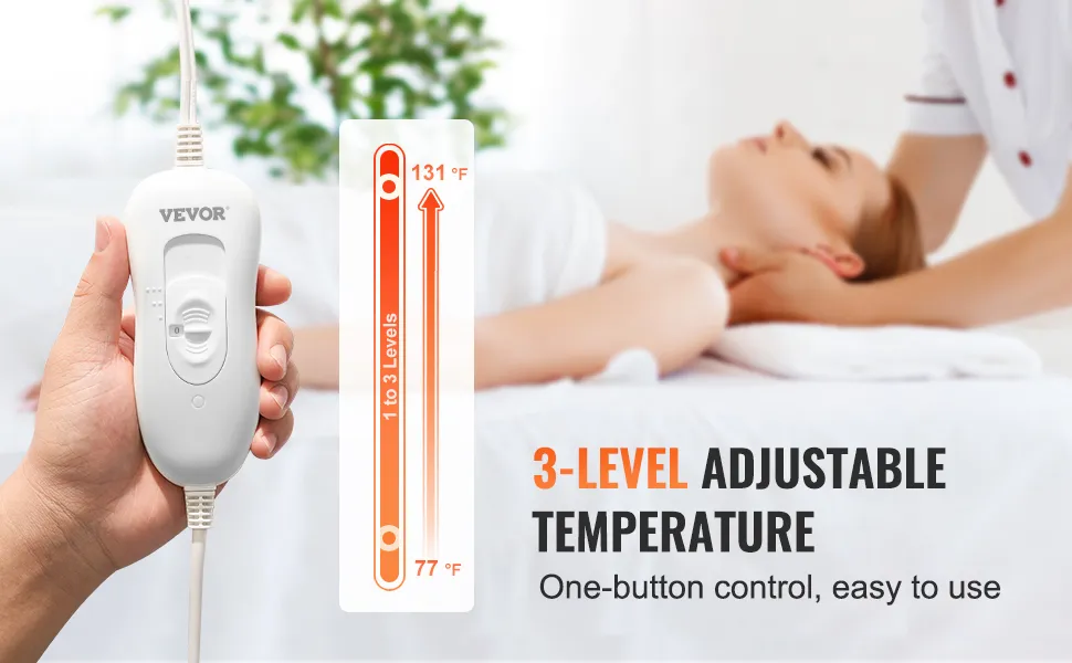 Podgrzewacz stołu do masażu VEVOR poprawia wrażenia z masażu dzięki polarowi o grubości 1,3 cm. Dzięki zakresowi temperatur 25–54°C, 3 poziomom ogrzewania i zabezpieczeniu przed przegrzaniem zapewnia bezpieczeństwo i komfort, zapewniając ciepło i przytulność.