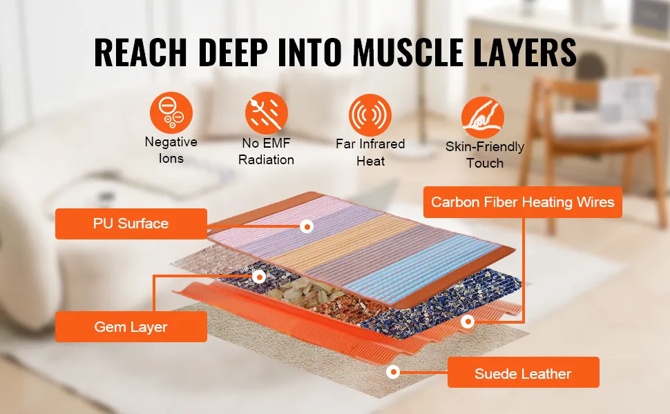 Zwiększone bezpieczeństwo: Ta mata z naturalnego kryształu wykonana jest z drutu grzewczego z włókna węglowego i równomiernie emituje dalekie promieniowanie podczerwone, które wnika głęboko w warstwy mięśni, łagodząc zmęczenie. Wolna od szkodliwego promieniowania elektromagnetycznego, zapewnia spokój ducha i bezpieczeństwo użytkowania, promując zdrowszy i bardziej relaksujący efekt terapeutyczny.