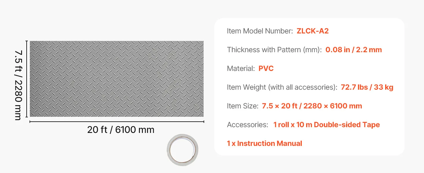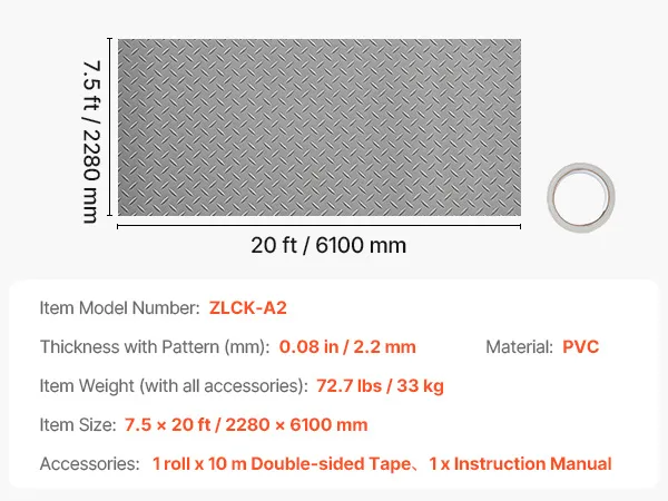Mata podłogowa do garażu VEVOR, 2280 x 6100 mm, antypoślizgowa, sprzedawana na metry, mata z wypustkami z tworzywa PVC o grubości 2,2 mm z dwustronną taśmą klejącą, mata ochronna na podłogę do magazynów i siłowni, srebrnoszara