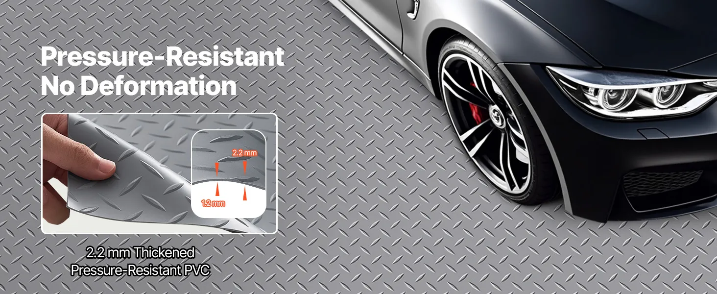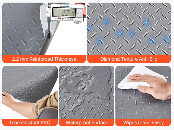 Wysokowydajny PVC: Ta mata antypoślizgowa jest wykonana z wysokowydajnego PVC o grubości 2,2 mm i charakteryzuje się doskonałą odpornością na zużycie i nacisk. Wytrzymuje przyczepy, ciężarówki i inne ciężkie pojazdy bez odkształceń, co zapewnia długą żywotność.