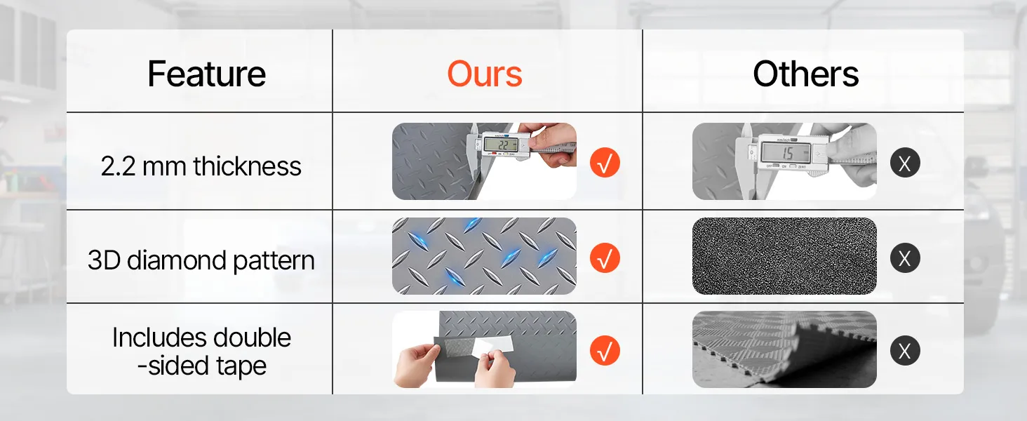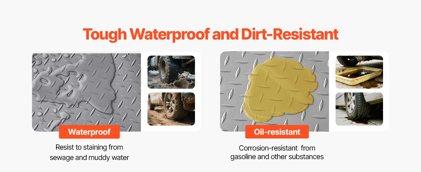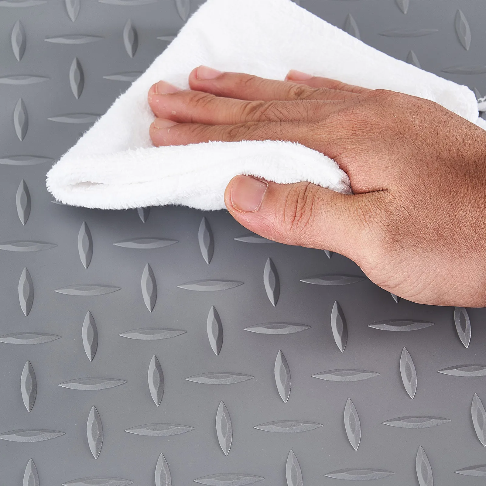 Stabilność i antypoślizgowość: Powierzchnia tej maty z wypustkami w kształcie rombów została zaprojektowana tak, aby zapobiegać poślizgom i poprawiać przyczepność. Zapewnia to bezpieczne chodzenie i parkowanie, nawet w mokrych warunkach. Użyj dołączonej dwustronnej taśmy klejącej, aby zapewnić mocną i trwałą przyczepność.