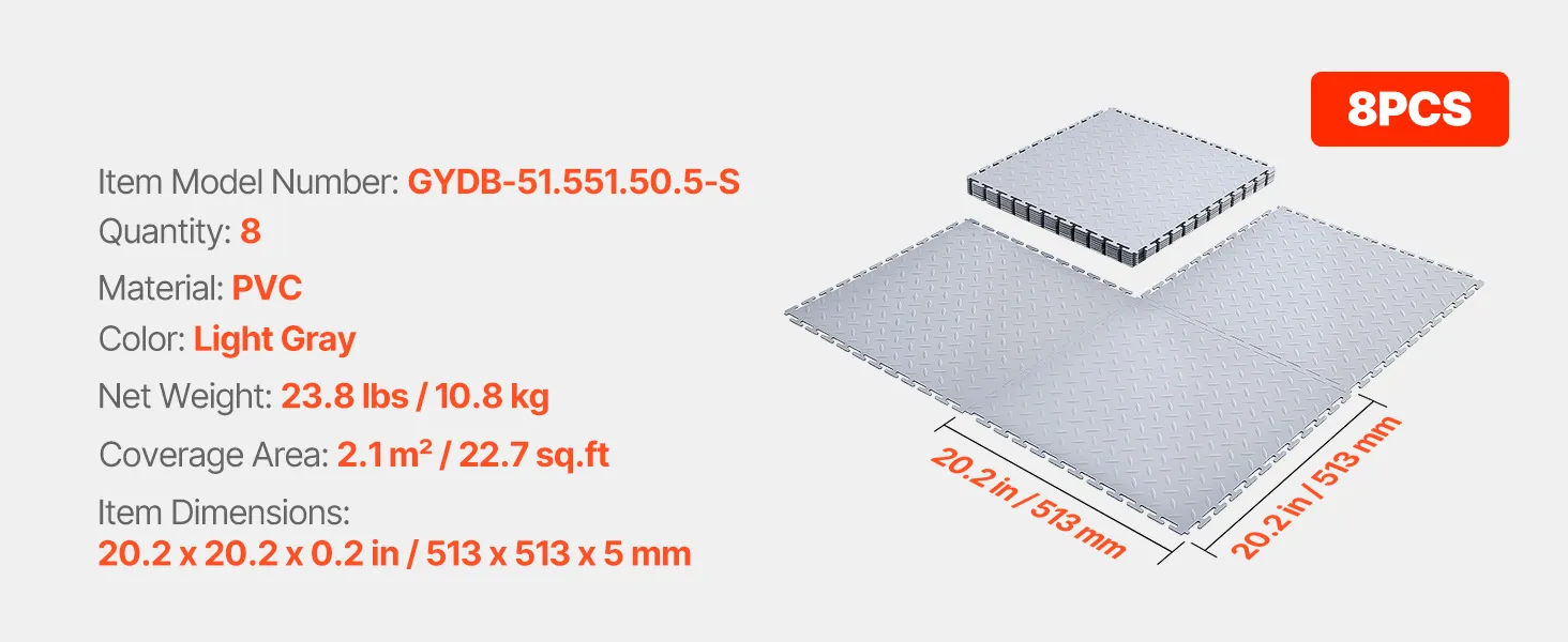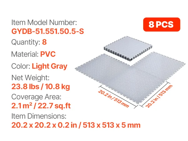 Maty garażowe PCV VEVOR, 8 szt., 513 x 513 x 5 mm, do warsztatów, do przemysłu, montaż na klik, antypoślizgowe maty PCV z płytką diamentową do warsztatów, magazynów, narzędziowni, kolor jasnoszary