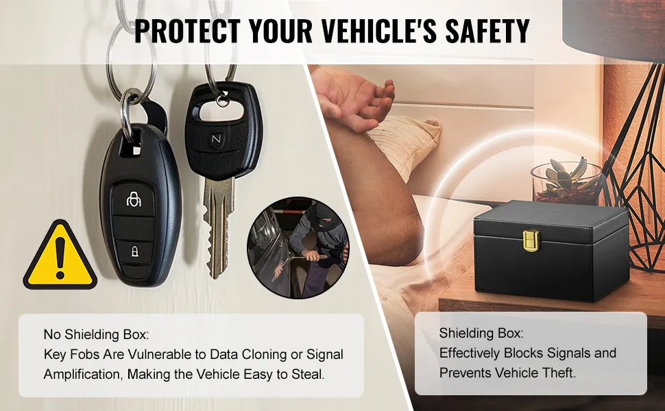 Kompleksowa ochrona: Czy nie miałbyś kłopotów, gdyby Twój pojazd został skradziony? Kradzieże pojazdów są obecnie powszechne, a Ty możesz po prostu użyć wzmacniacza sygnału, aby zdalnie wzmocnić sygnały z samochodu bezkluczykowego, gdy śpisz. Ta skrzynka Faradaya została zaprojektowana, aby zapobiegać kradzieży pojazdów. Uniemożliwia ona złodziejom odbieranie i przekazywanie sygnałów z Twoich kluczyków, zapobiegając kradzieży i kradzieży bezkluczykowego zapłonu. Zapewnia wystarczającą ochronę Twojego pojazdu i Twoich danych.