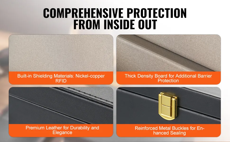 Skuteczne ekranowanie: Wykorzystuje wiele specjalnych materiałów, aby lepiej chronić sygnał przed kradzieżą. Po przeprowadzeniu testów, nasze produkty są wykonane z wysokiej jakości skóry poliuretanowej (PU). Pod wyjątkowym i trwałym wyglądem, wewnętrzna warstwa wykonana jest z wysokiej jakości dwuwarstwowego materiału ekranującego: płyty gęstościowej i niklowo-miedzianego RFID, a także metalowych plomb blokujących. Ekranowanie sygnału jest niemal idealne i skutecznie blokuje wszystkie rodzaje sygnałów wchodzących i wychodzących z urządzenia. Uwaga: Aby zapewnić efekt blokowania sygnału, należy zamknąć pokrywę!
