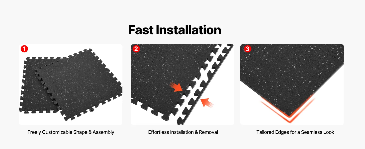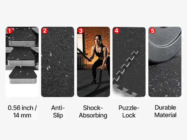 Wytrzymałe i odporne na zużycie: Wykonane z odpornej na zużycie gumy. Nawet w przypadku stosowania z urządzeniami powodującymi stałe tarcie, takimi jak stojaki na rowery treningowe i rowery spinningowe, nasze gumowe dywaniki podłogowe nie zużyją się ani nie rozerwą zbyt szybko.