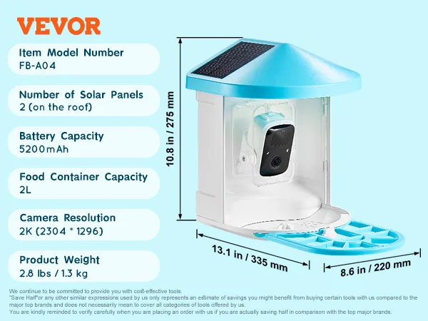 Sztuczna inteligencja identyfikuje ponad 10 000 gatunków ptaków: Inteligentny karmnik dla ptaków VEVOR z kamerą wyposażony jest w zaawansowany system rozpoznawania oparty na sztucznej inteligencji (30-dniowy okres próbny), który potrafi zidentyfikować ponad 10 000 gatunków ptaków. Automatycznie rejestruje i identyfikuje każdego odwiedzającego ptaka i natychmiast powiadamia o tym za pośrednictwem aplikacji.