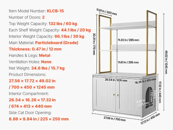 Stabilna i wytrzymała: Nasza szafka na kuwetę dla kota jest wyposażona w metalową półkę i konstrukcję, która wytrzymuje obciążenie 60 kg na górze i 30 kg wewnątrz. Zapewnia miejsce na nawilżacze powietrza, odtwarzacze CD, płyty CD i rośliny, nie odkształcając się z czasem.