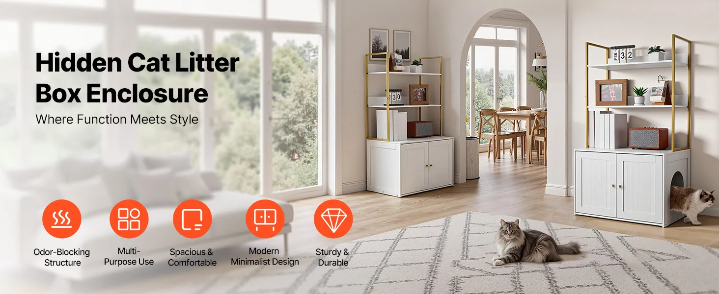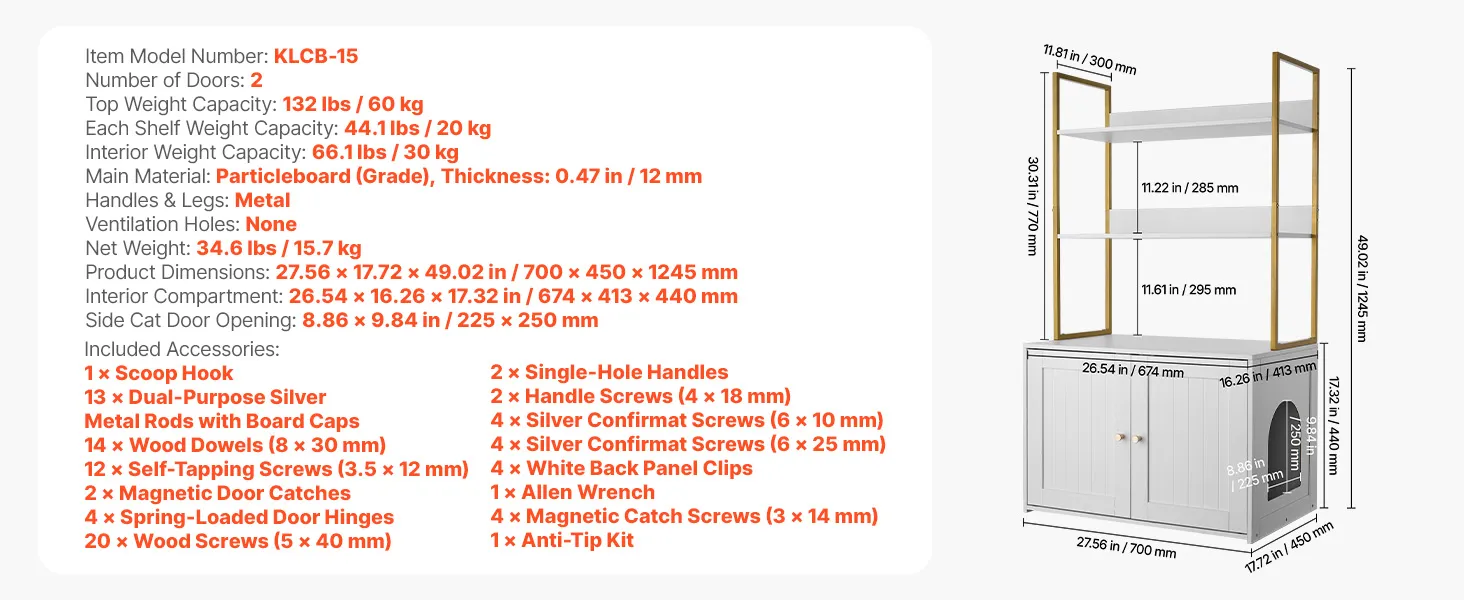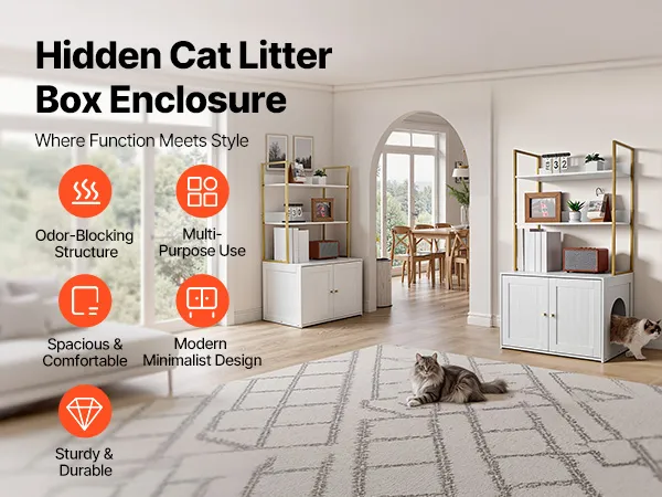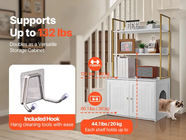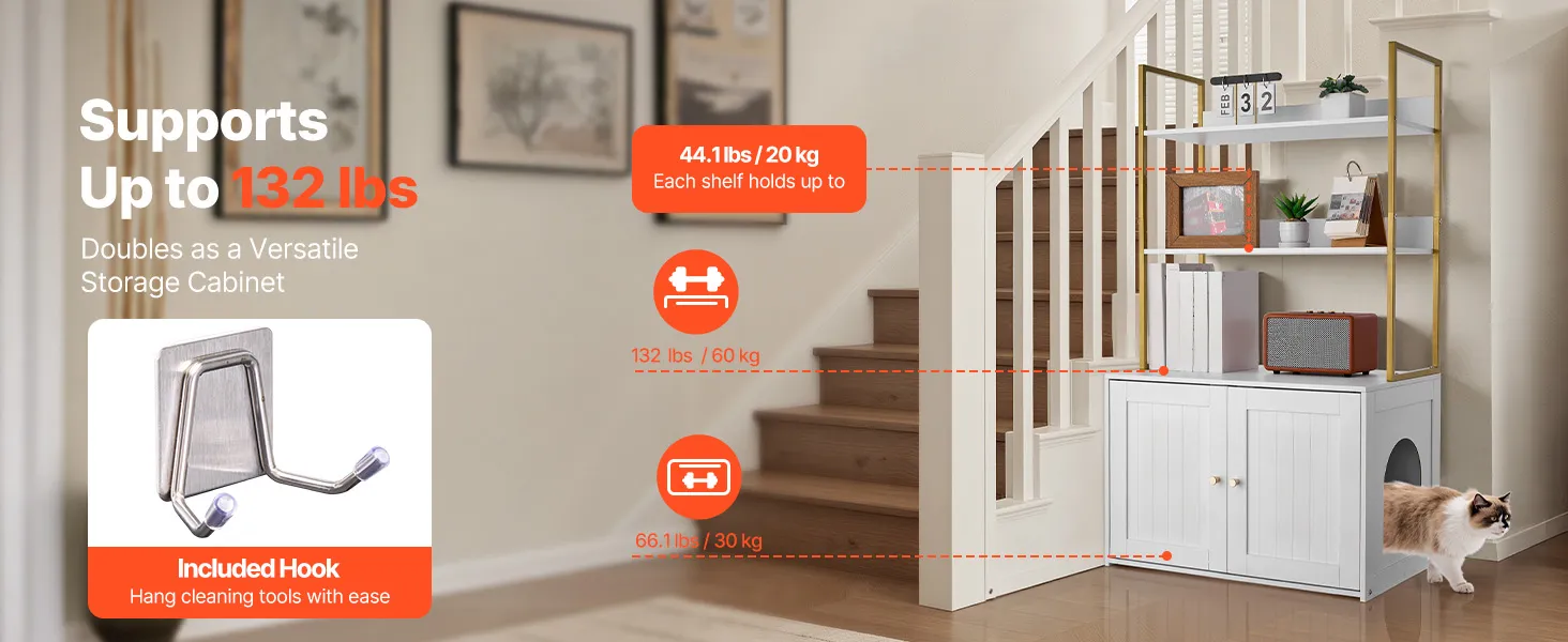 Szafka dla kota VEVOR, 700x450x1245 mm, kuweta dla kota z metalowymi nogami i 2-poziomowymi półkami, szafka na kuwetę dla kota, domek dla kota, pasuje do większości kuwet, do salonu