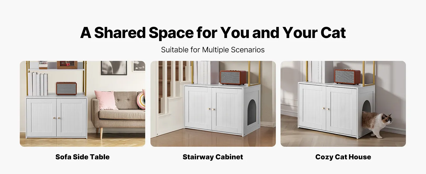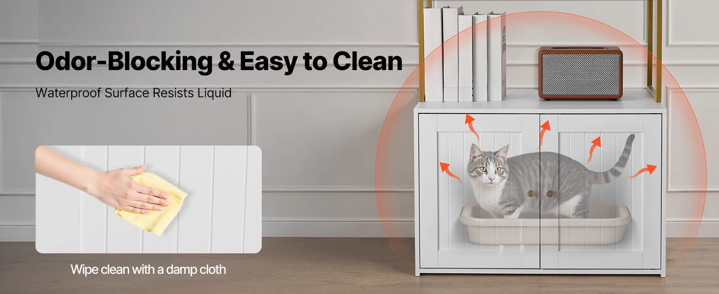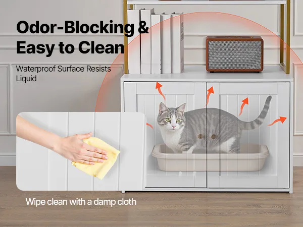 Zamknięta blokada zapachów: Szafka dla kota jest wyposażona w zamkniętą obudowę, która tworzy środowisko bezzapachowe, skutecznie blokując rozprzestrzenianie się zapachów i utrzymując świeże powietrze w pomieszczeniu. Zapewnia kotom prywatną, wolną od stresu przestrzeń podczas użytkowania.