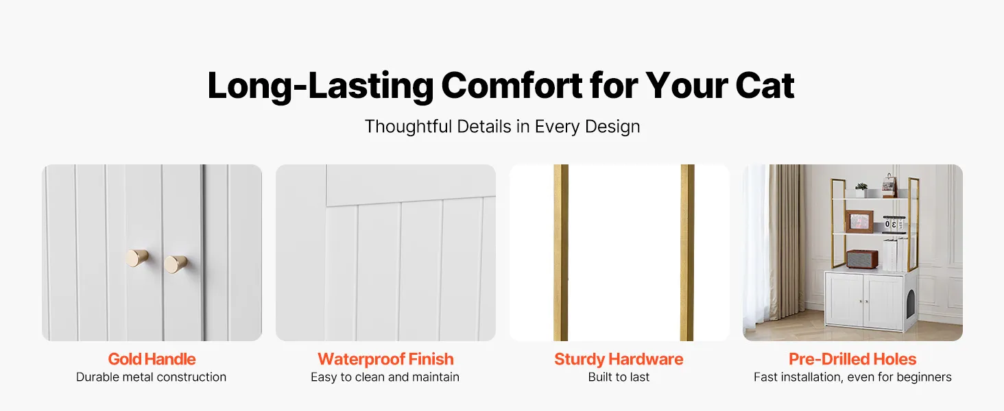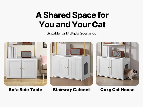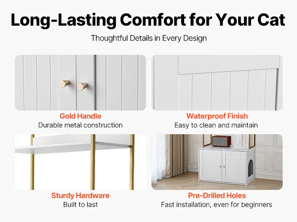Wszechstronne zastosowanie: Te ukryte kuwety dla kotów mogą służyć jako stoliki boczne, szafki do przechowywania, stoliki kawowe, szafki w przedpokoju lub jako legowiska dla kotów. Biała szafka ze złotymi uchwytami i złotą metalową półką idealnie wpasowuje się w różnorodne style aranżacji wnętrz.