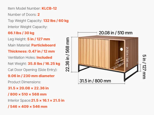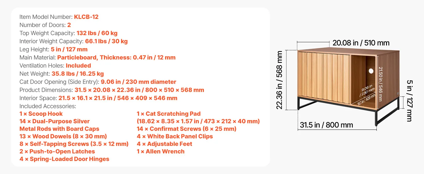 Stabilna i wytrzymała: Dzięki metalowym nóżkom i konstrukcji przypominającej szafkę, nasza obudowa kuwety dla kota jest stabilna i trwała. Udźwig wynosi 60 kg na górze i 30 kg wewnątrz, a pomieści nawilżacze powietrza, rośliny doniczkowe lub książki, nie odkształcając się z czasem.