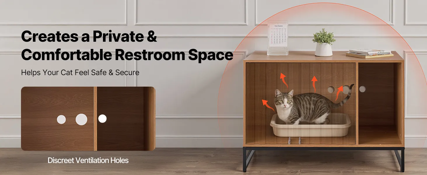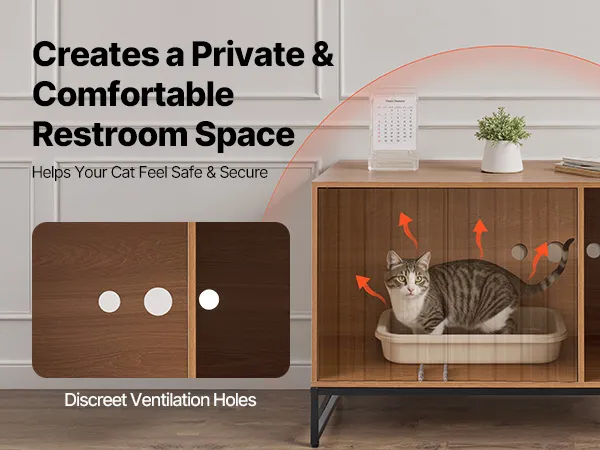 Kuweta dla kota ma zamkniętą konstrukcję z ukrytymi otworami wentylacyjnymi, które blokują zapachy, zapewniając jednocześnie cyrkulację powietrza. Dzięki temu Twoje koty mają zapewnioną zamkniętą i prywatną toaletę.