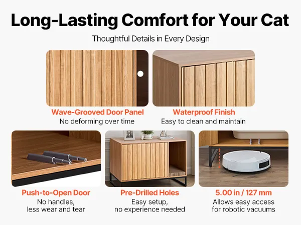Wysoka kompatybilność z przestrzenią: szafka na kuwetę dla kota ma przestronne wnętrze o wymiarach 546 x 409 x 546 mm i jest kompatybilna ze standardowymi kuwetami. Zintegrowana konstrukcja przegródek ułatwia kotom przechodzenie i ogranicza rozpryskiwanie żwirku.