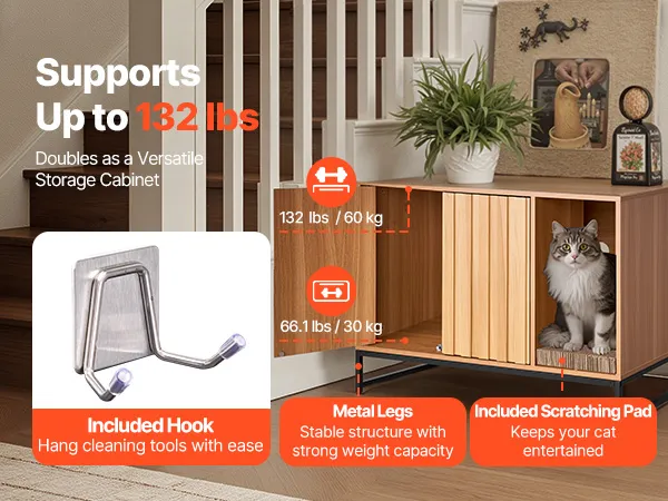 Górna platforma naszych mebli do kuwety dla kotów wytrzymuje obciążenie do 60 kg i z łatwością zapewnia miejsce na książki, dekoracje i inne przedmioty. Służy jako drapak, zapewniając rozrywkę Twoim kotom i pozostaje stabilna nawet wtedy, gdy skaczą na nią duże koty.