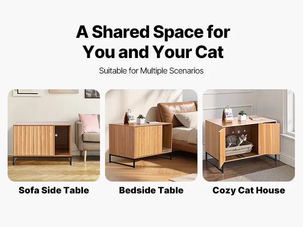 Wszechstronne zastosowanie: Te ukryte kuwety dla kotów mogą służyć jako stoliki boczne, nocne, stoliki kawowe, szafki przedpokojowe lub jako legowiska dla kotów. Falisty panel drzwi o fakturze drewna z czarnymi metalowymi nogami idealnie komponuje się z różnymi stylami aranżacji wnętrz.