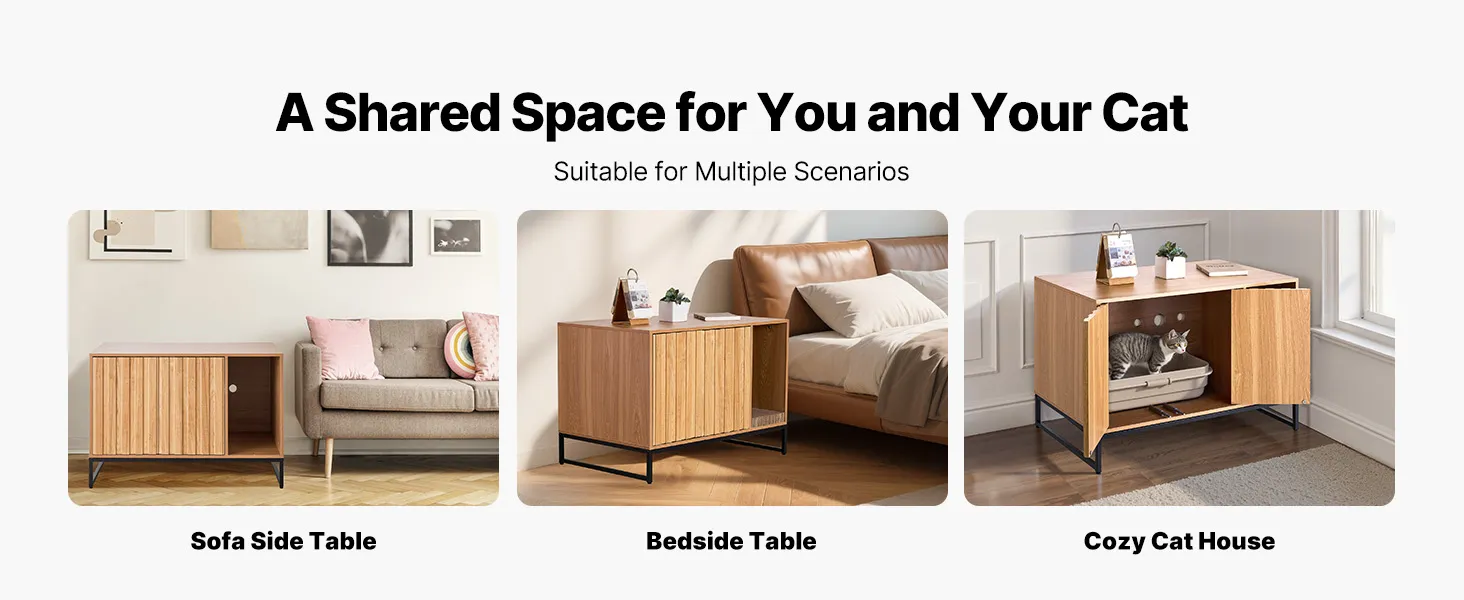 Nasza ukryta kuweta dla kota pełni funkcję szafki na kuwetę, stolika nocnego, stolika przy sofie i domku dla kota w jednym. Idealnie wpasowuje się w różne style aranżacji wnętrz, takie jak salony i sypialnie.